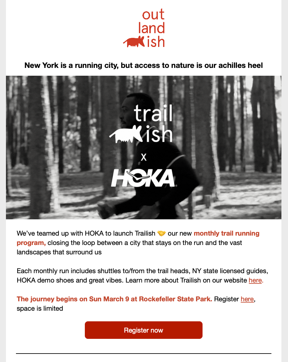 Outlandish wanted to expand upon its mission to help New Yorkers reconnect with nature. Building upon the success of their Hikeish program with Salomon, trail running was a next natural step. The store enlisted another powerhouse brand, HOKA, to provide funding support and shoe demos for participants.